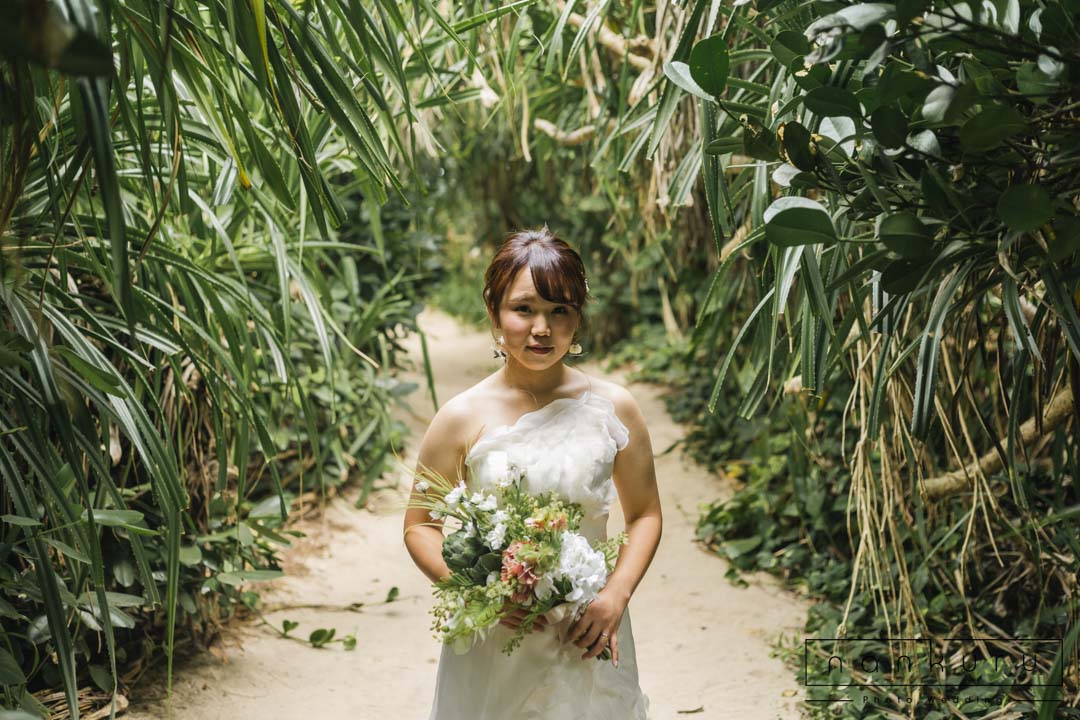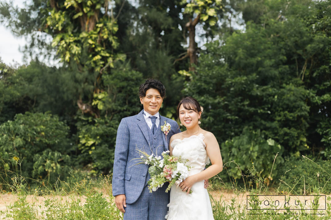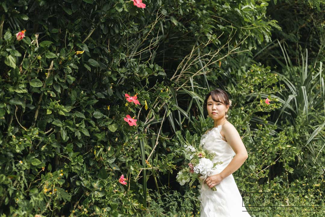 恩納村の綺麗な海を背景に撮影ができるのはもちろん、緑の中でも撮影できるので、様々な写真が残せます。