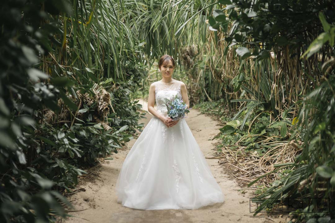 恩納村の綺麗な海を背景に撮影ができるのはもちろん、緑の中でも撮影できるので、様々な写真が残せます。