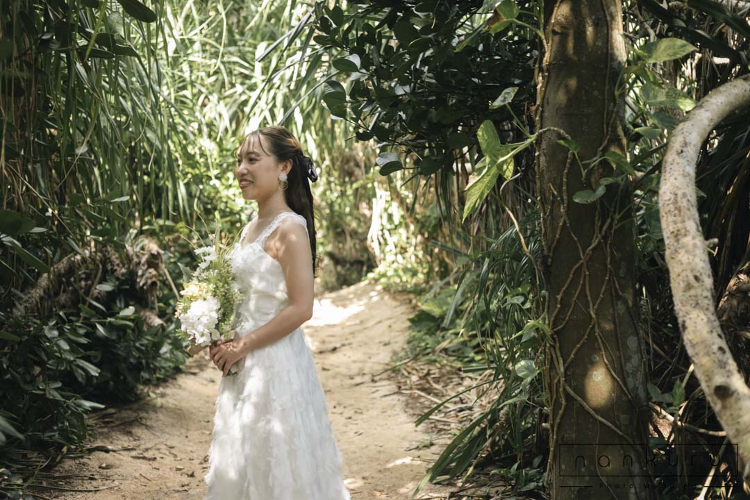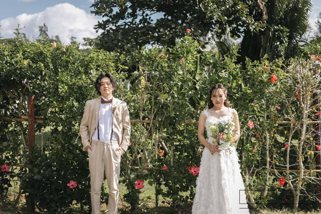 恩納村の綺麗な海を背景に撮影ができるのはもちろん、緑の中でも撮影できるので、様々な写真が残せます。