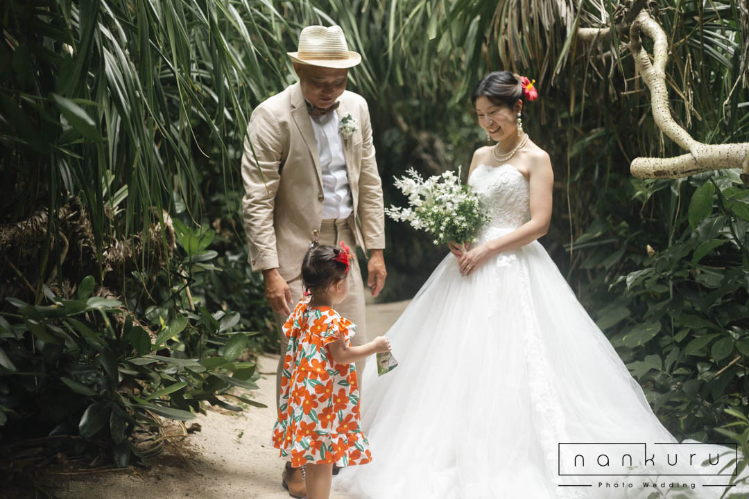 恩納村の綺麗な海を背景に撮影ができるのはもちろん、緑の中でも撮影できるので、様々な写真が残せます。