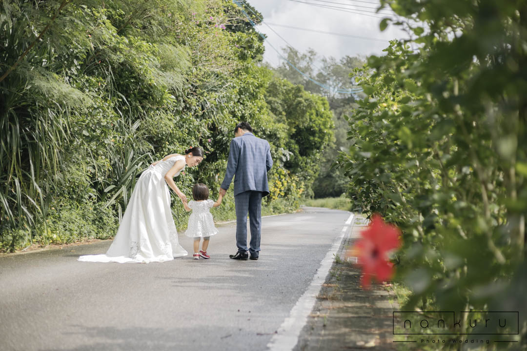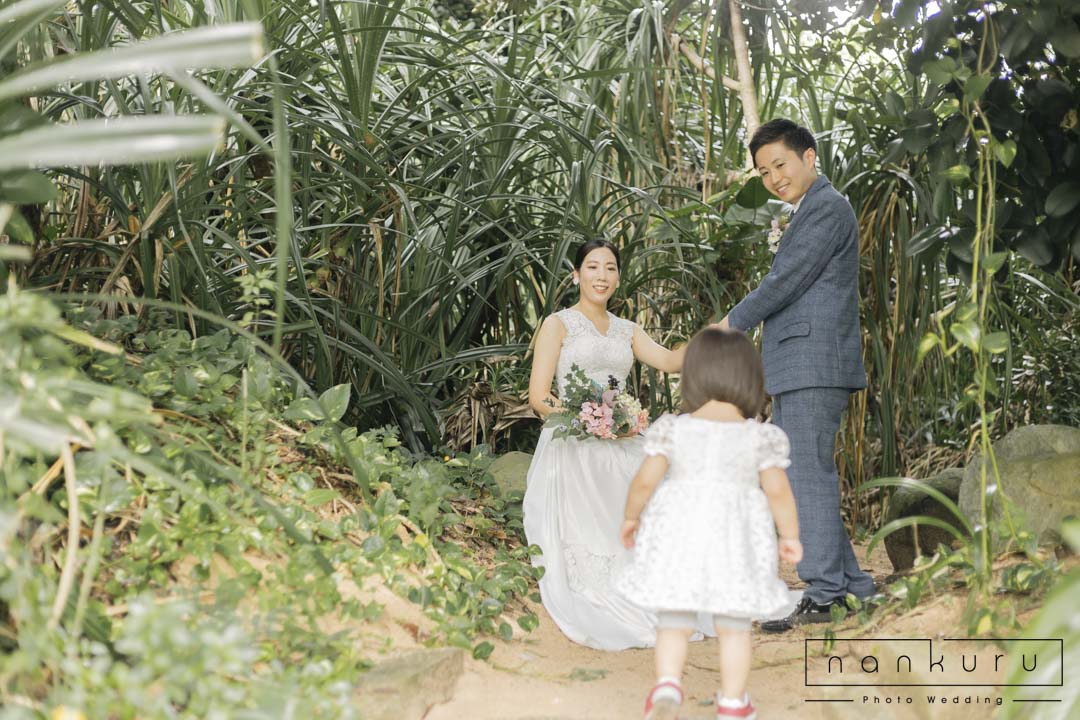 恩納村の綺麗な海を背景に撮影ができるのはもちろん、緑の中でも撮影できるので、様々な写真が残せます。