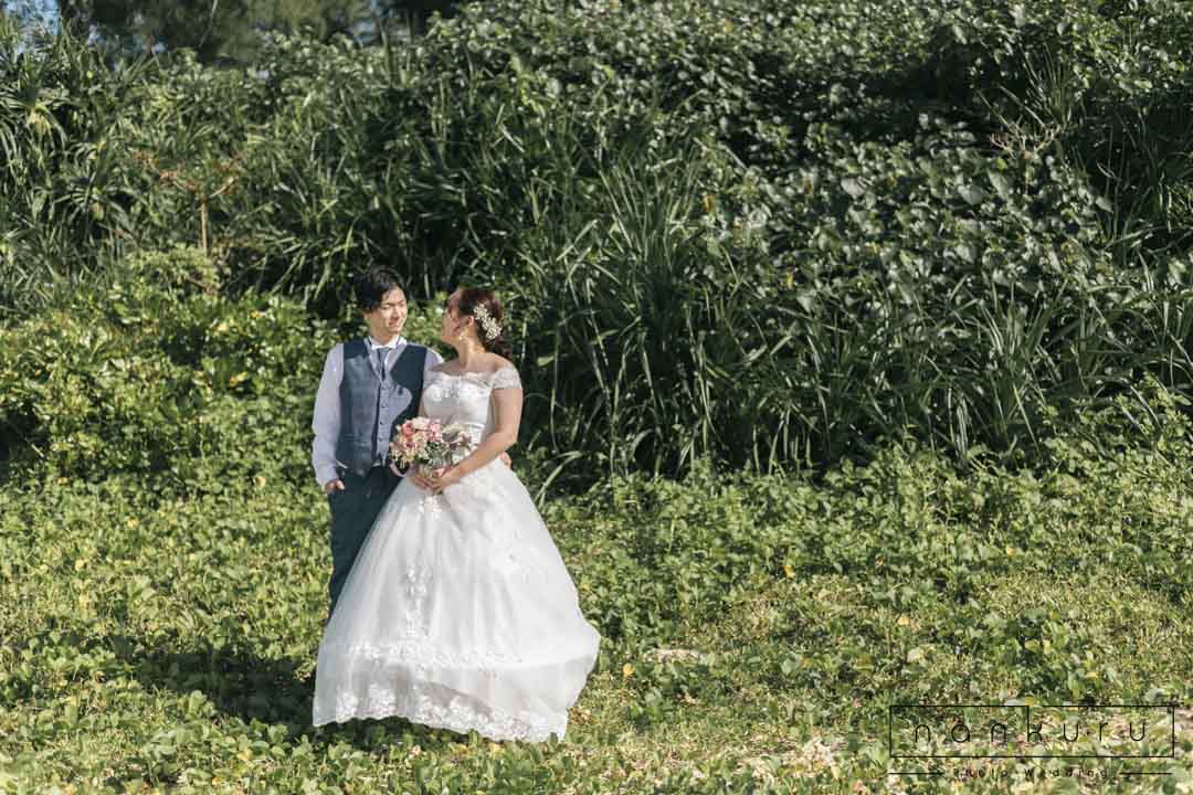 恩納村の綺麗な海を背景に撮影ができるのはもちろん、緑の中でも撮影できるので、様々な写真が残せます。