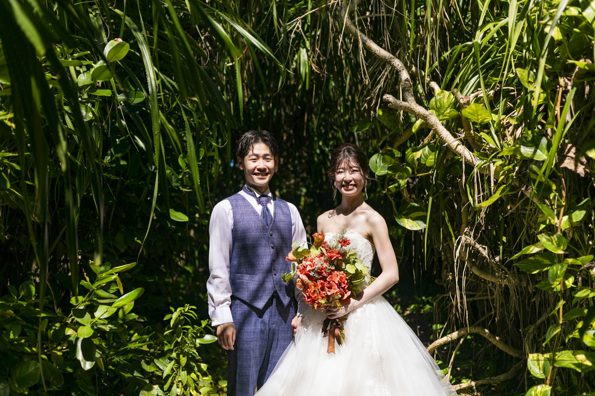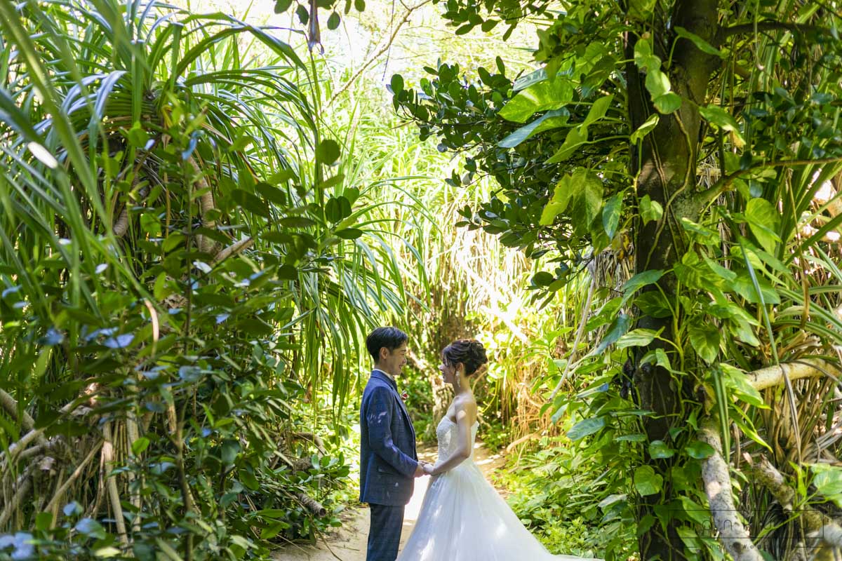 恩納村の綺麗な海を背景に撮影ができるのはもちろん、緑の中でも撮影できるので、様々な写真が残せます。