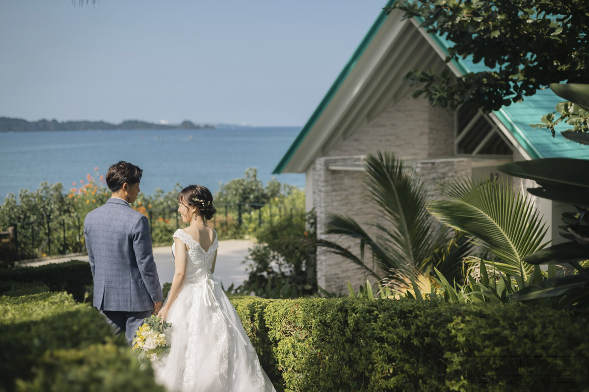 恩納村の綺麗な海を背景に撮影ができるのはもちろん、緑の中でも撮影できるので、様々な写真が残せます。